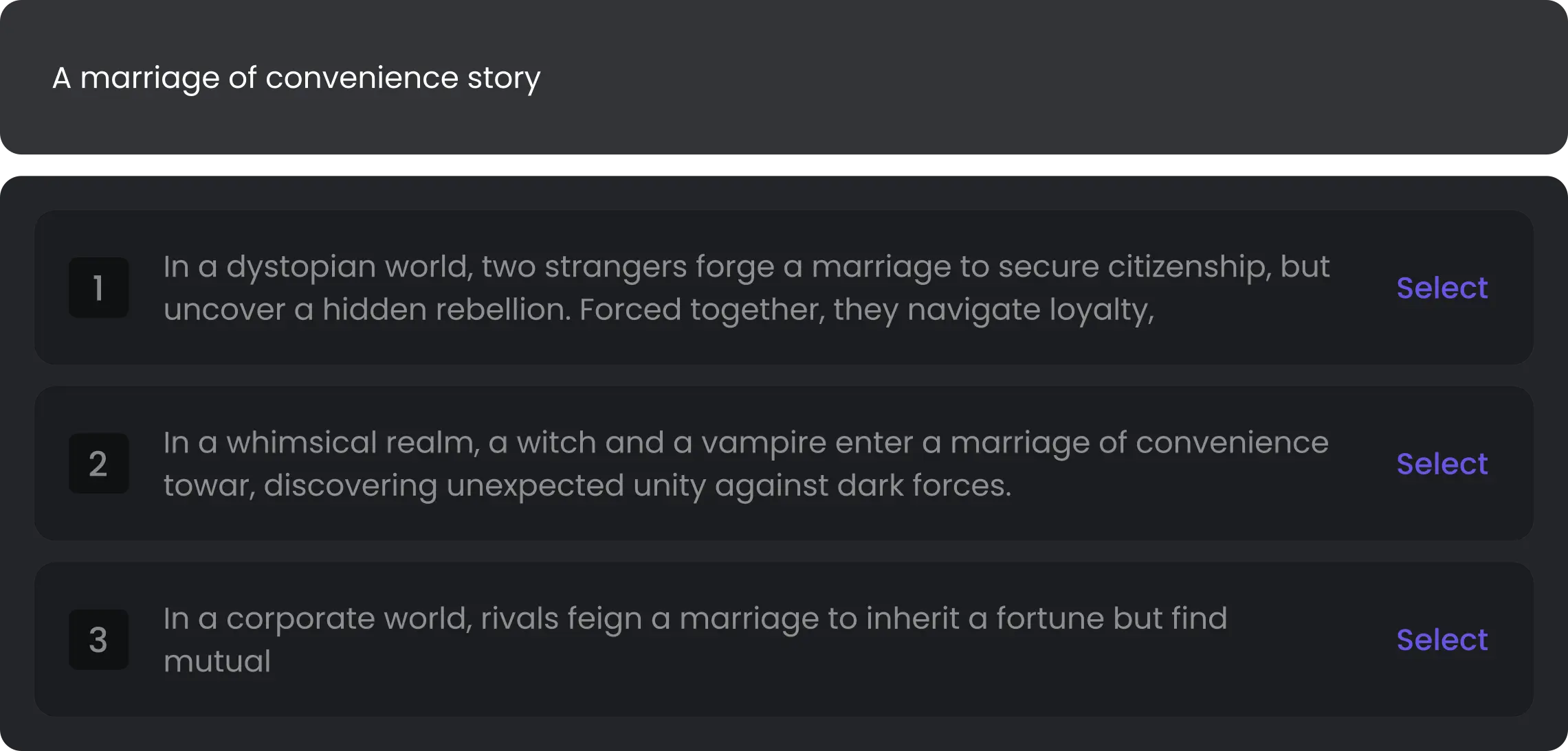Use your imagination to craft a basic story idea with just one line of text. We’ll then help you enrich your idea to make the story more attractive.